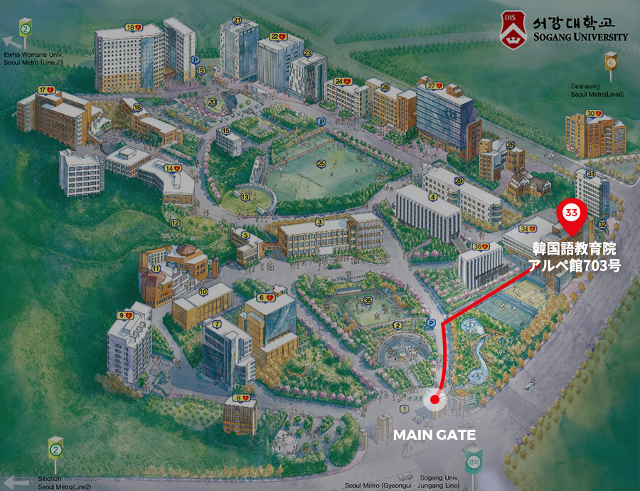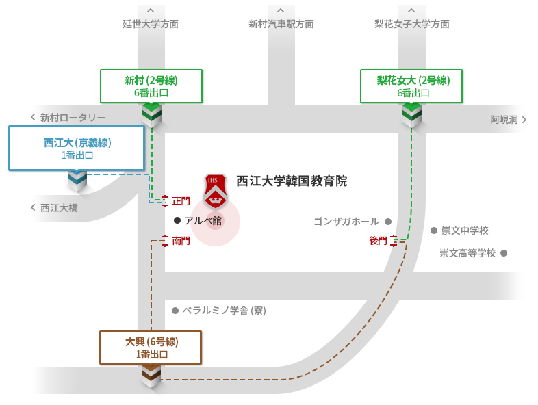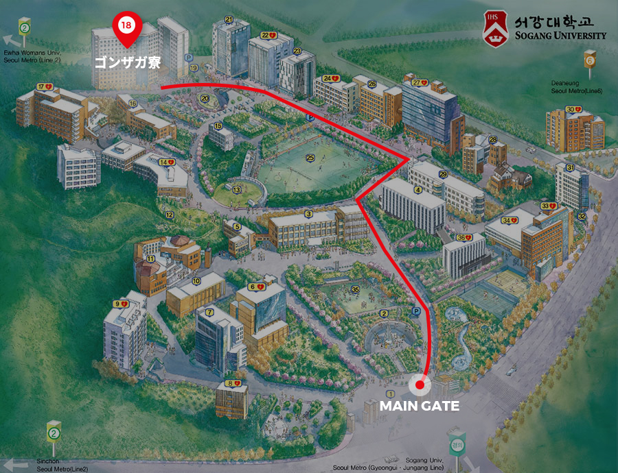 1階入国層5Bあるいは12A乗車上で6002に乗って新村現代デパートで降りる (新村現代デパートまで約80分所要、交通事情よって変わる) |